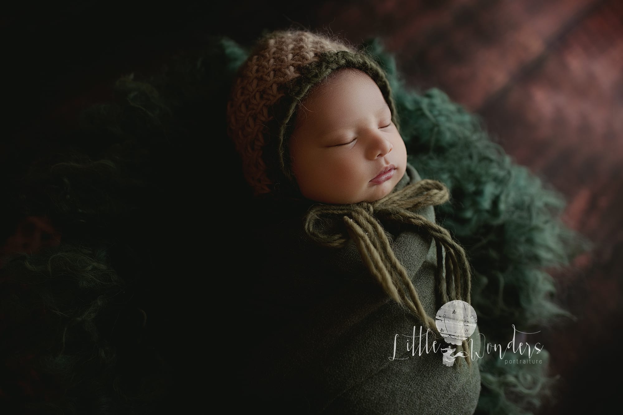 After the sibling shots, I swaddled Raine in a pretty hunter green wrap and placed him in a bowl. Then I added a bonnet. He looked so cute with the bonnet tied beneath his chubby little cheeks and chin.