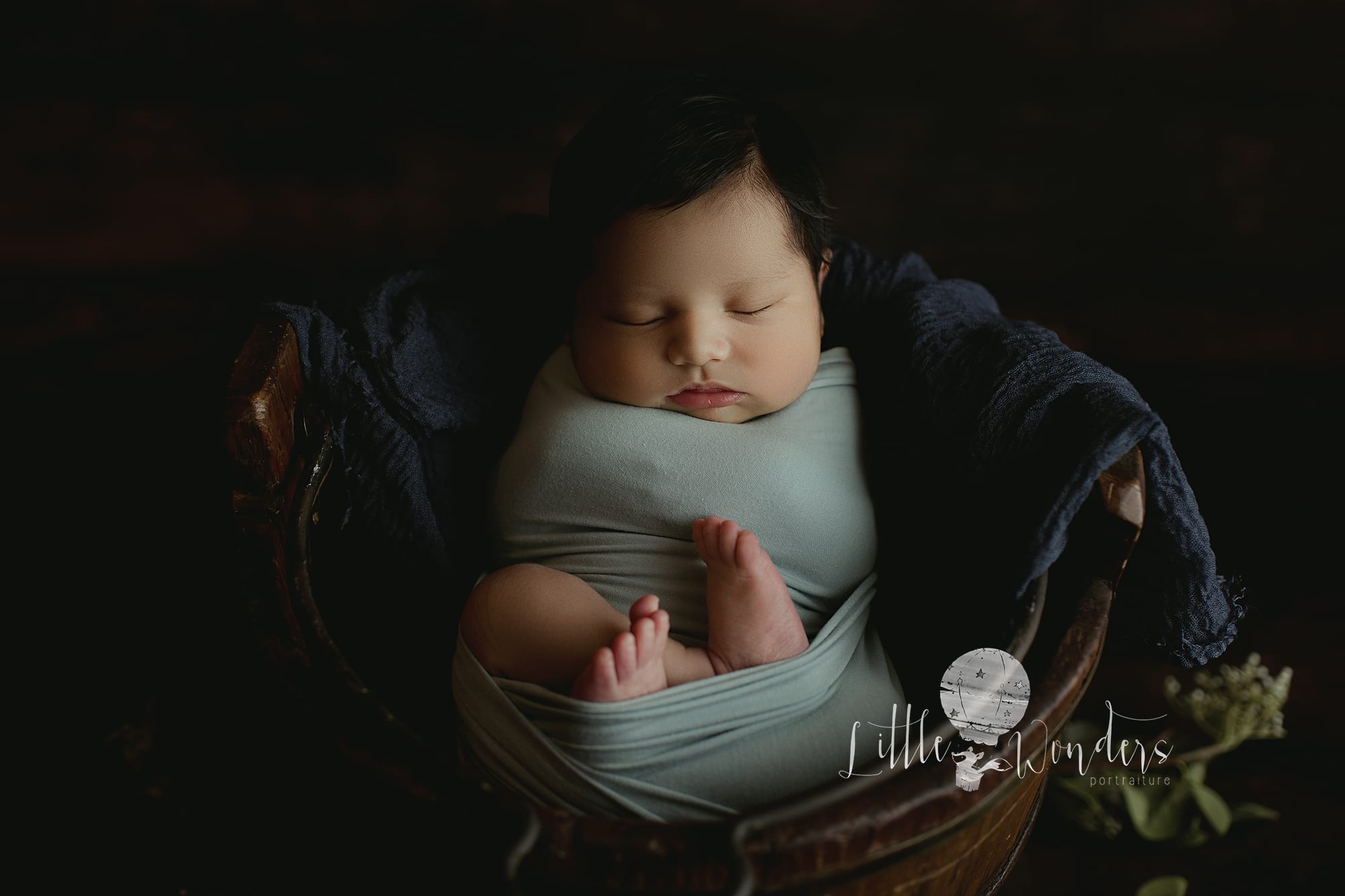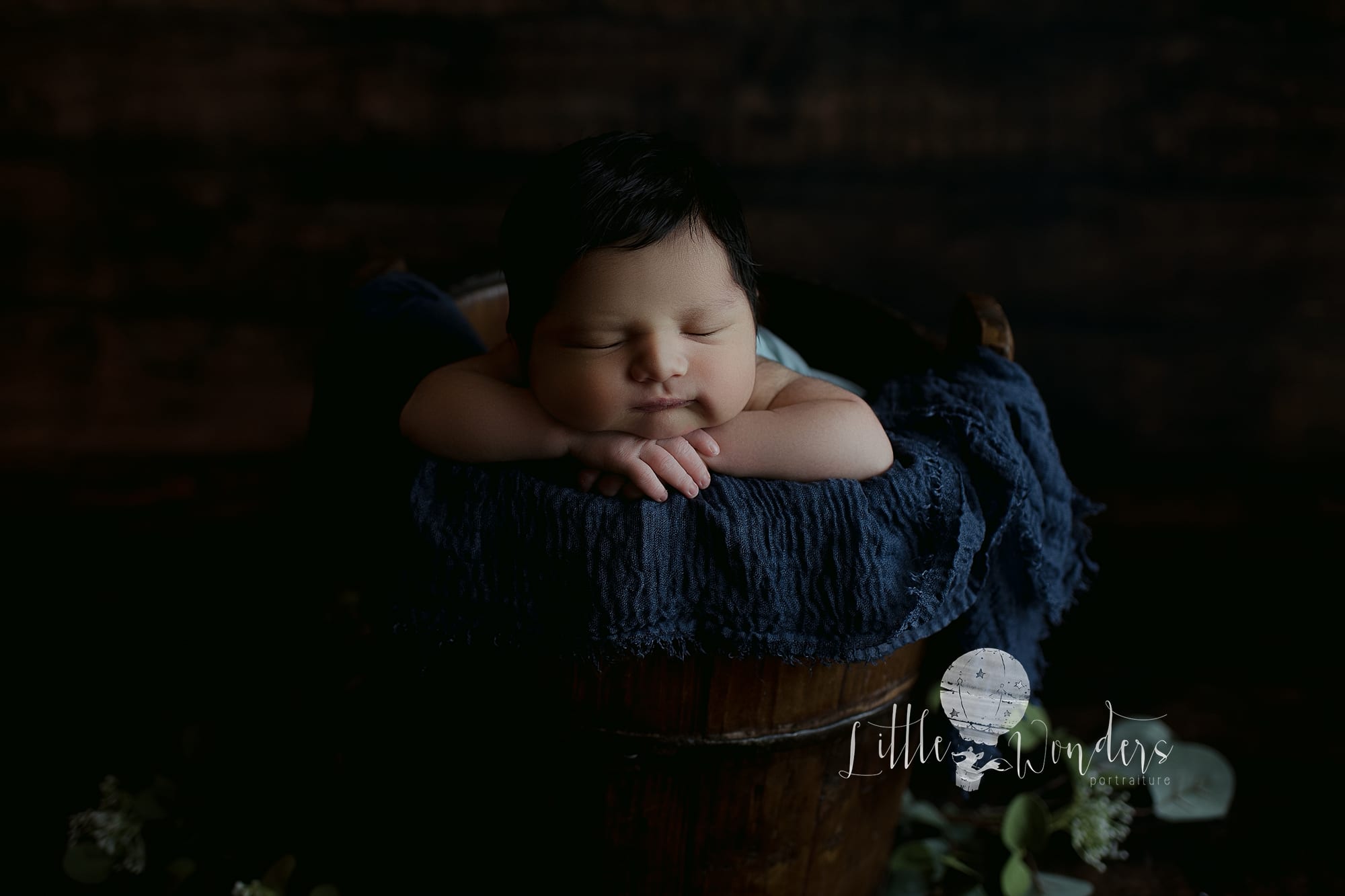 Finally, I ended the shoot with the bucket shots. Navy blue and light blue were chosen this time. I also added greenery around the bucket. I got photos of him on his back and then with his chin on his hands. He stayed asleep for his whole session!